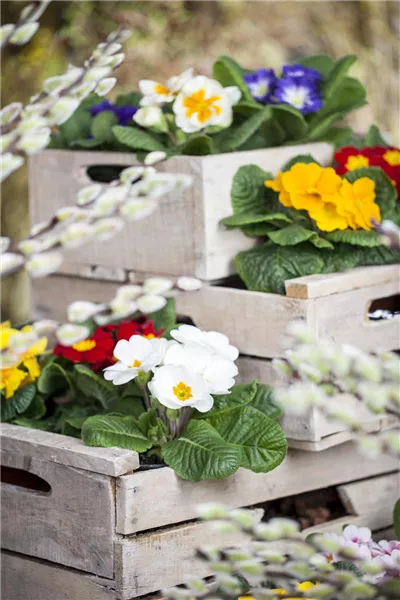 Stellen Sie Ihre Primeln hell, aber nicht direkt in die Sonne. Auch wenn es draußen noch winterlich kalt ist, kündigen diese charmanten, dezent duftenden Blütenklassiker bereits den Frühling an. In schönen Gefäßen, solo oder kombiniert mit Zwergnarzissen und Topftulpen, nebst passenden Accessoires, setzen sie heitere Akzente überall im Haus.