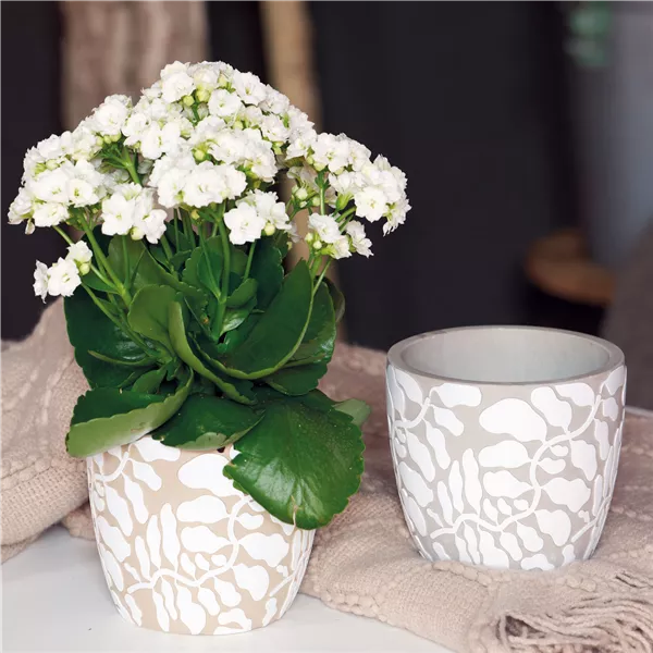 Der Übertopf aus Beton mit einem floralen Muster passt sich aufgrund seiner zurückhaltenden Farbigkeit spielend leicht in den Oster-Trend ein.