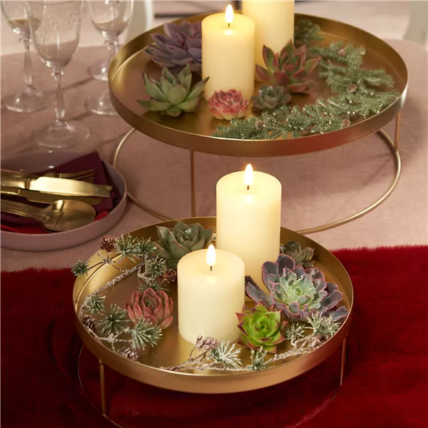 Das goldfarbene Tablett mit elegantem Standfuß in zwei Größen bietet den idealen Rahmen für vielseitige Dekorationen. Darauf sorgen Kerzen aus Kunststoff mit Timerfunktion für warmes Licht und gemütliche Stimmung. Gemeinsam entfalten sie den edlen Charakter des Trends "GLAMOUR TIME"– stilvoll, üppig und ausdrucksstark. Die goldfarbenen Tannen aus Dolomit glänzen mit der Weihnachtszeit um die Wette. Ihre metallische Oberfläche bringt Raffinesse in die Dekoration, einzeln oder im Duo arrangiert. Mit ihrer weichen Formensprache und dem edlen Grauton fügt sich die flache Vase harmonisch in die festliche Inszenierung ein. Ob mit Zweigen, Kerzen oder glänzenden Accessoires bestückt verleiht sie Arrangements eine moderne Note.