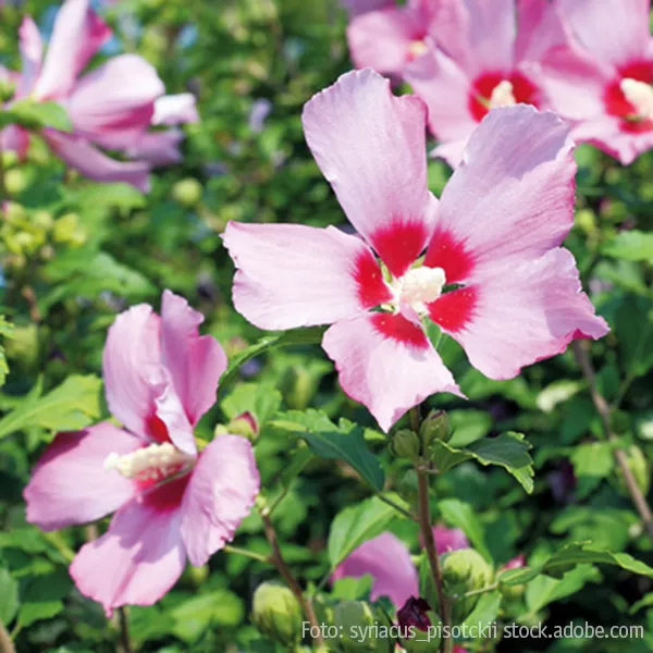 Der Strauch-Eibisch (Hibiscus syriacus), auch Echter Roseneibisch genannt, ist ein winterharter, sommergrüner Strauch, der Ihre Hecke zum Blühen bringt. Er kommt ursprünglich aus Asien, wo er seit über 2.000 Jahren kultiviert wird. In Südkorea ist er auf der Ein-Won-Münze zu sehen und gilt inoffiziell als Nationalblume. Seine Hauptblütezeit ist dann, wenn die meisten anderen Gehölze bereits verblüht sind. Die malvenartigen Blüten erscheinen je nach Sorte von Juli bis September. Damit er auch in Hülle und Fülle blüht, ist ein sonniger Standort in nährstoffreichen, durchlässigen Boden unabdingbar. Der Strauch-Eibisch ist robust und pflegeleicht. Ist es im Hochsommer über einen längeren Zeitraum trocken, sollten Sie gießen. Er eignet sich sowohl als Heckenpflanze als auch zur Einzelstellung oder Pflanzung in kleineren Gruppen. Um einen buschigen Wuchs und viele Blüten zu gewährleisten, sollten Sie den Eibisch alle 2 bis 3 Jahre im Frühjahr schneiden. Die Blüten erscheinen nämlich ausschließlich an frischen Trieben.