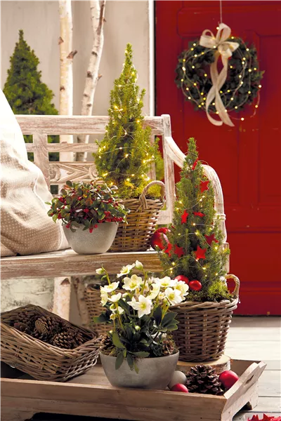 Liebhaber von verspielten Dekorationselementen wie niedlichen Figuren oder eleganten Laternen finden ein großes Angebot an batteriebetriebenen, leuchtenden Artikeln vor, die sparsam und langlebig sind. Zwergkoniferen wie Weißzeder (Chamaecyparis thyoides) oder Zuckerhutfichte (Picea glauca) fügen sich perfekt in jedes Dekoarrangement ein und stellen mit ihrem Dunkelgrün einen wirkungsvollen Kontrast zum Erleuchteten dar. Im originellen Pflanzkorb verleiht es dem Bäumchen mit einem geformten Rahmen eine weihnachtliche, strahlende Kontur.