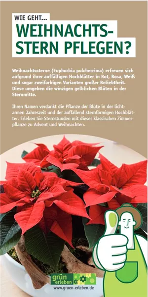Alle Informationen rund um den Weihnachtsstern, deren Herkunft, Pflege, Standortansprüche, etc. finden Sie in unserer Pflegekarte.